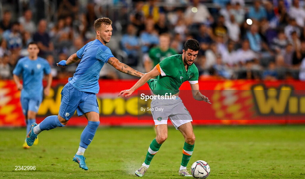 27 September 2022; Finn Azaz of Republic of Ireland in action against Eden Karzev of Israel during the UEFA European U21 Championship play-off second leg match between Israel and Republic of Ireland at Bloomfield Stadium in Tel Aviv, Israel. Photo by Seb Daly/Sportsfile