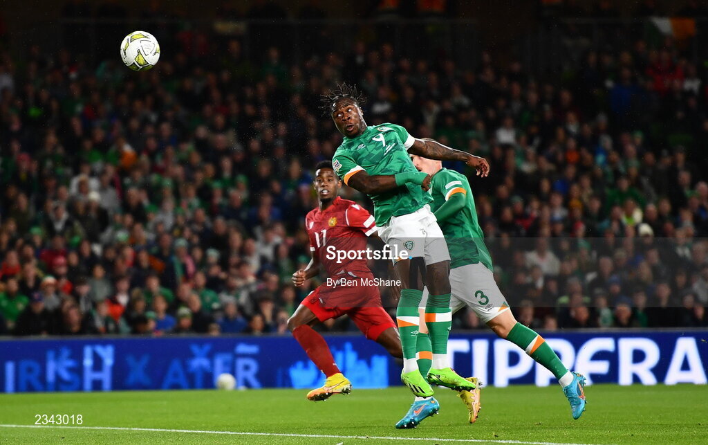 27 September 2022; Michael Obafemi of Republic of Ireland has a header on goal during the UEFA Nations League B Group 1 match between Republic of Ireland and Armenia at Aviva Stadium in Dublin. Photo by Ben McShane/Sportsfile