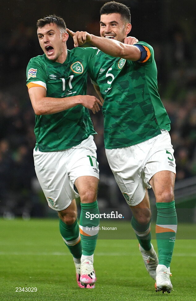 27 September 2022; John Egan of Republic of Ireland celebrates with team-mate Jason Knight, left, after scoring their side's first goal during the UEFA Nations League B Group 1 match between Republic of Ireland and Armenia at Aviva Stadium in Dublin. Photo by Eóin Noonan/Sportsfile