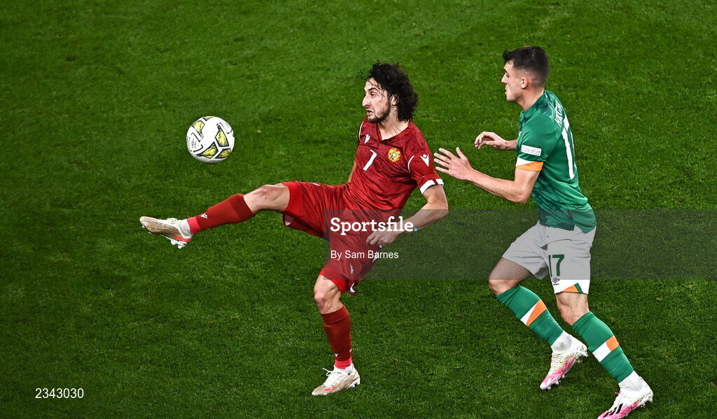 27 September 2022; Khoren Bayramyan of Armenia in action against Jason Knight of Republic of Ireland during the UEFA Nations League B Group 1 match between Republic of Ireland and Armenia at Aviva Stadium in Dublin. Photo by Sam Barnes/Sportsfile