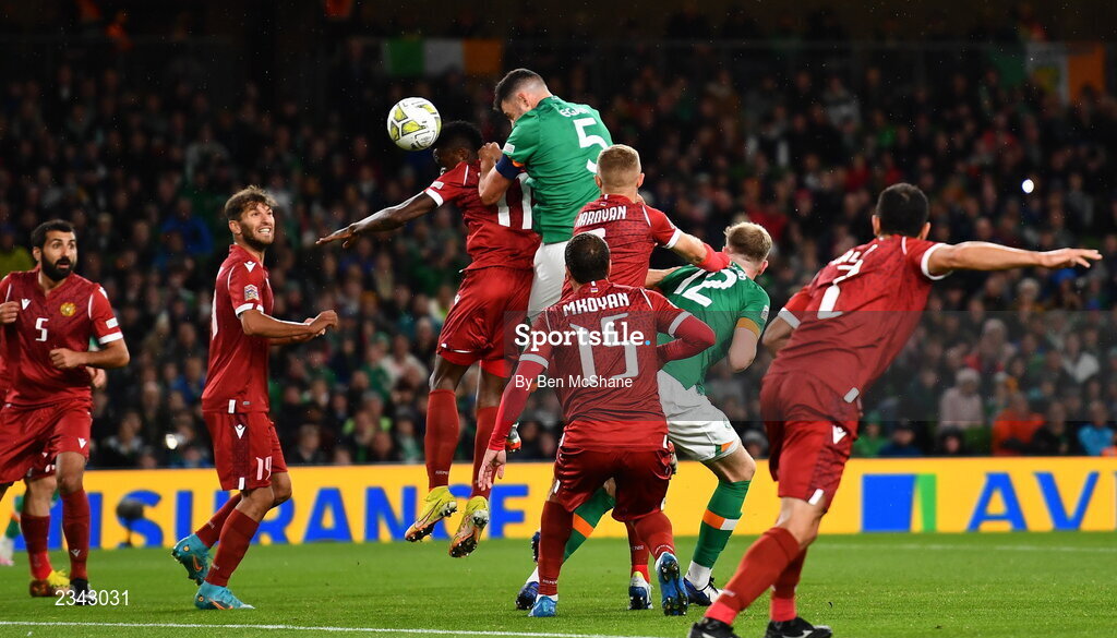 27 September 2022; John Egan of Republic of Ireland heads his side's first goal during the UEFA Nations League B Group 1 match between Republic of Ireland and Armenia at Aviva Stadium in Dublin. Photo by Ben McShane/Sportsfile