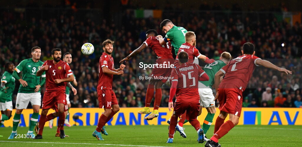 27 September 2022; John Egan of Republic of Ireland heads his side's first goal during the UEFA Nations League B Group 1 match between Republic of Ireland and Armenia at Aviva Stadium in Dublin. Photo by Ben McShane/Sportsfile