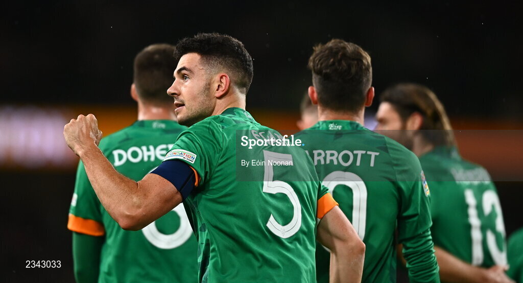 27 September 2022; John Egan of Republic of Ireland celebrates after scoring his side's first goal during the UEFA Nations League B Group 1 match between Republic of Ireland and Armenia at Aviva Stadium in Dublin. Photo by Eóin Noonan/Sportsfile