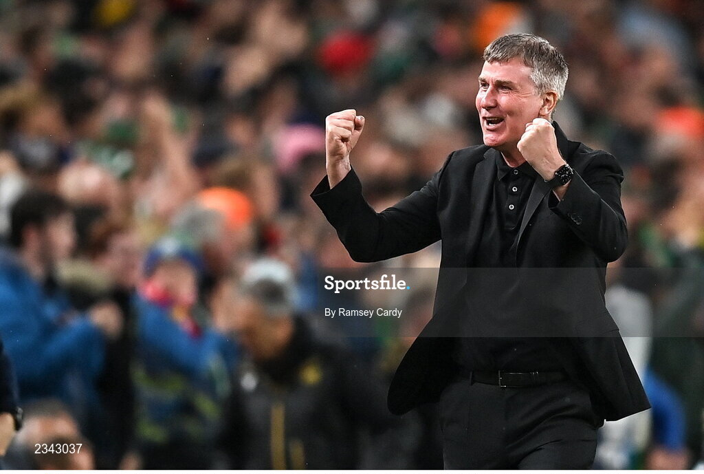 27 September 2022; Republic of Ireland manager Stephen Kenny celebrates his side's first goal, scored by John Egan, not pictured, during the UEFA Nations League B Group 1 match between Republic of Ireland and Armenia at Aviva Stadium in Dublin. Photo by Ramsey Cardy/Sportsfile