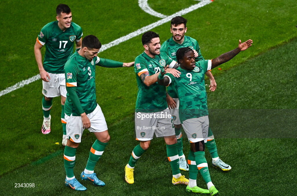 27 September 2022; Michael Obafemi of Republic of Ireland celebrates with teammates after scoring their side's second goal during the UEFA Nations League B Group 1 match between Republic of Ireland and Armenia at Aviva Stadium in Dublin. Photo by Sam Barnes/Sportsfile