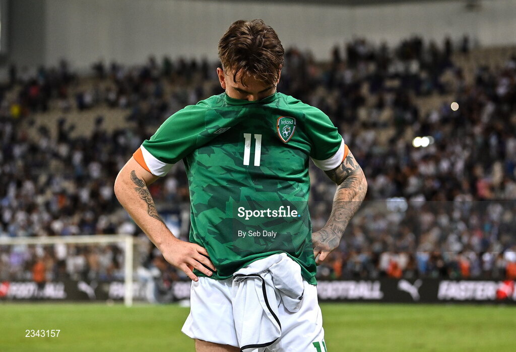 27 September 2022; Aaron Connolly of Republic of Ireland reacts after defeat in a penalty shoot out after the UEFA European U21 Championship play-off second leg match between Israel and Republic of Ireland at Bloomfield Stadium in Tel Aviv, Israel. Photo by Seb Daly/Sportsfile