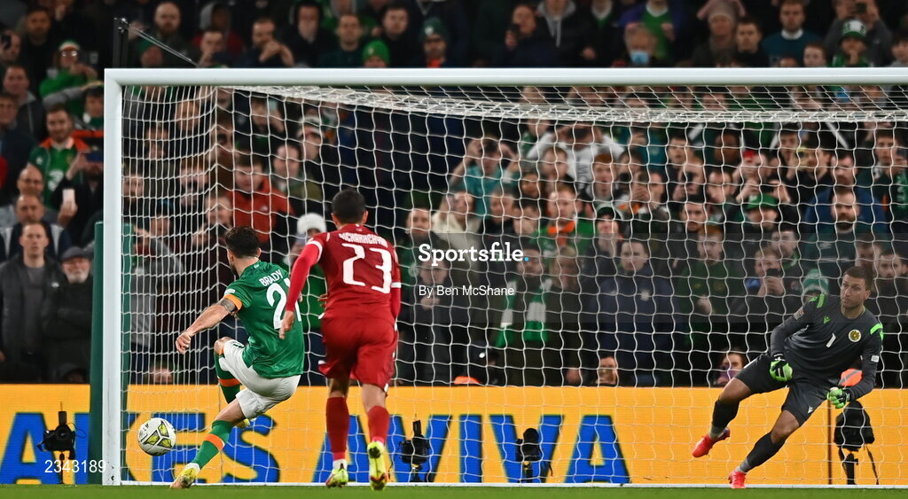 27 September 2022; Robbie Brady of Republic of Ireland shoots to score his side's third goal, a penalty, past Armenia goalkeeper David Yurchenko during the UEFA Nations League B Group 1 match between Republic of Ireland and Armenia at Aviva Stadium in Dublin. Photo by Ben McShane/Sportsfile