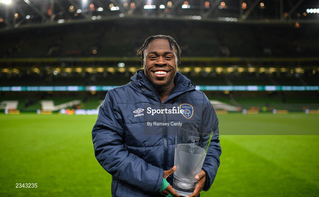 27 September 2022; Michael Obafemi of Republic of Ireland poses with the player of the match award after the UEFA Nations League B Group 1 match between Republic of Ireland and Armenia at Aviva Stadium in Dublin. Photo by Ramsey Cardy/Sportsfile