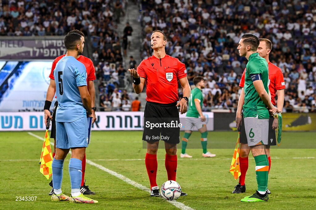 27 September 2022; Referee Nathan Verboomen with team captains Conor Coventry of Republic of Ireland, right, and Gil Cohen of Israel before the UEFA European U21 Championship play-off second leg match between Israel and Republic of Ireland at Bloomfield Stadium in Tel Aviv, Israel. Photo by Seb Daly/Sportsfile