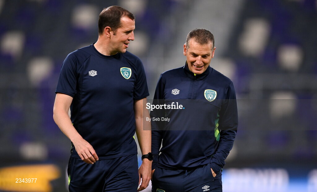 27 September 2022; Republic of Ireland manager Jim Crawford, right, and assistant coach John O'Shea before the UEFA European U21 Championship play-off second leg match between Israel and Republic of Ireland at Bloomfield Stadium in Tel Aviv, Israel. Photo by Seb Daly/Sportsfile