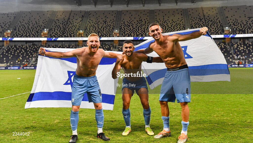 27 September 2022; Israel players, from left, Ido Shahar, Gil Cohen and Roi Herman celebrate after their side's victory in the UEFA European U21 Championship play-off second leg match between Israel and Republic of Ireland at Bloomfield Stadium in Tel Aviv, Israel. Photo by Seb Daly/Sportsfile