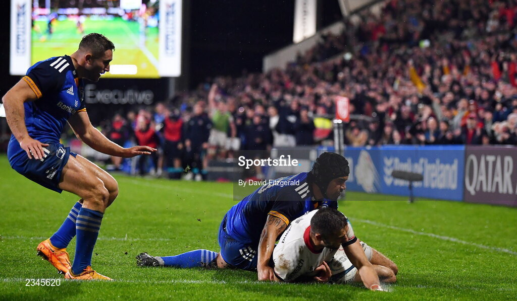 30 September 2022; Charlie Ngatai of Leinster knocks the ball from the grasp of Aaron Sexton of Ulster to prevent a try during the United Rugby Championship match between Ulster and Leinster at Kingspan Stadium in Belfast. Photo by David Fitzgerald/Sportsfile