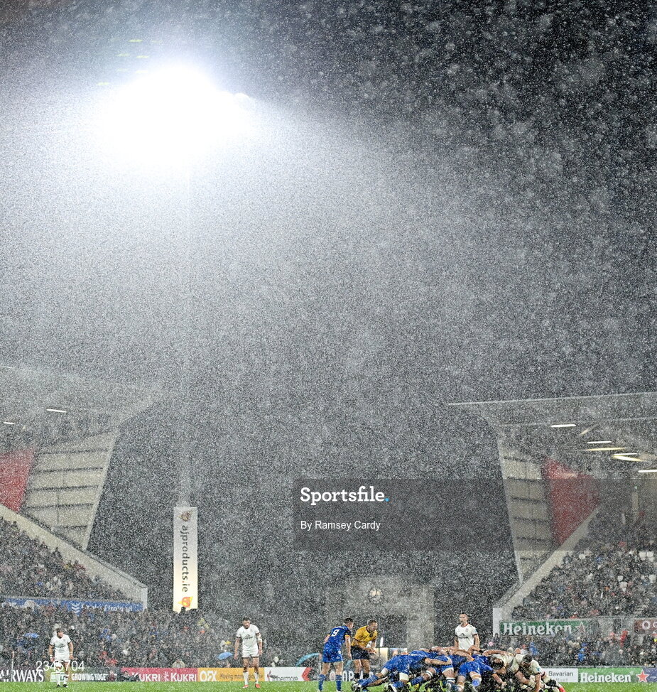 30 September 2022; A general view of a scrum during heavy rain in the United Rugby Championship match between Ulster and Leinster at Kingspan Stadium in Belfast. Photo by Ramsey Cardy/Sportsfile