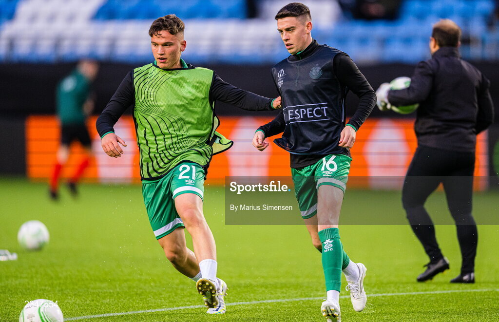 6 October 2022; Justin Ferizaj, left, and Gary O'Neill of Shamrock Rovers before the UEFA Europa Conference League group F match between Molde and Shamrock Rovers at Aker Stadion in Molde, Norway. Photo by Marius Simensen/Sportsfile