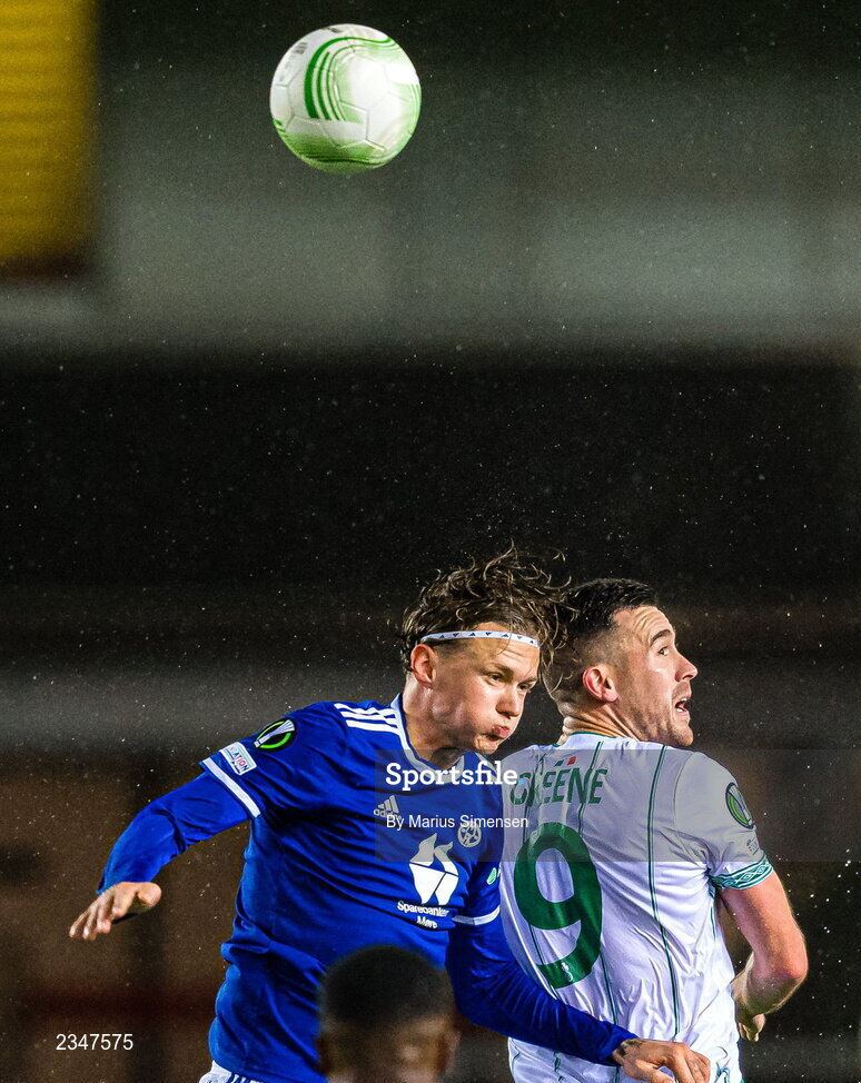 6 October 2022; Birk Risa of Molde in action against Aaron Greene of Shamrock Rovers during the UEFA Europa Conference League group F match between Molde and Shamrock Rovers at Aker Stadion in Molde, Norway. Photo by Marius Simensen/Sportsfile