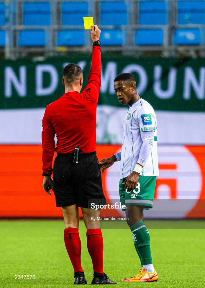 6 October 2022; Aidomo Emakhu of Shamrock Rovers is shown a yellow card by referee Miloš Milanovic during the UEFA Europa Conference League group F match between Molde and Shamrock Rovers at Aker Stadion in Molde, Norway. Photo by Marius Simensen/Sportsfile
