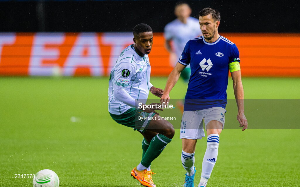 6 October 2022; Martin Linnes of Molde in action against Aidomo Emakhu of Shamrock Rovers during the UEFA Europa Conference League group F match between Molde and Shamrock Rovers at Aker Stadion in Molde, Norway. Photo by Marius Simensen/Sportsfile
