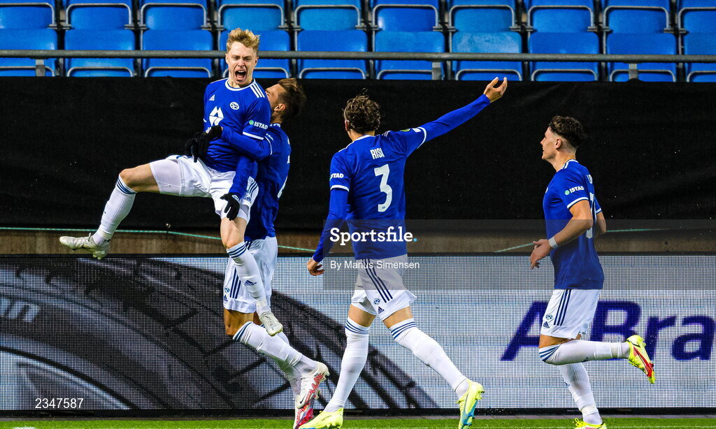 6 October 2022; Ola Brynhildsen of Molde, left, celebrates with teammates after scoring their side's second goal during the UEFA Europa Conference League group F match between Molde and Shamrock Rovers at Aker Stadion in Molde, Norway. Photo by Marius Simensen/Sportsfile
