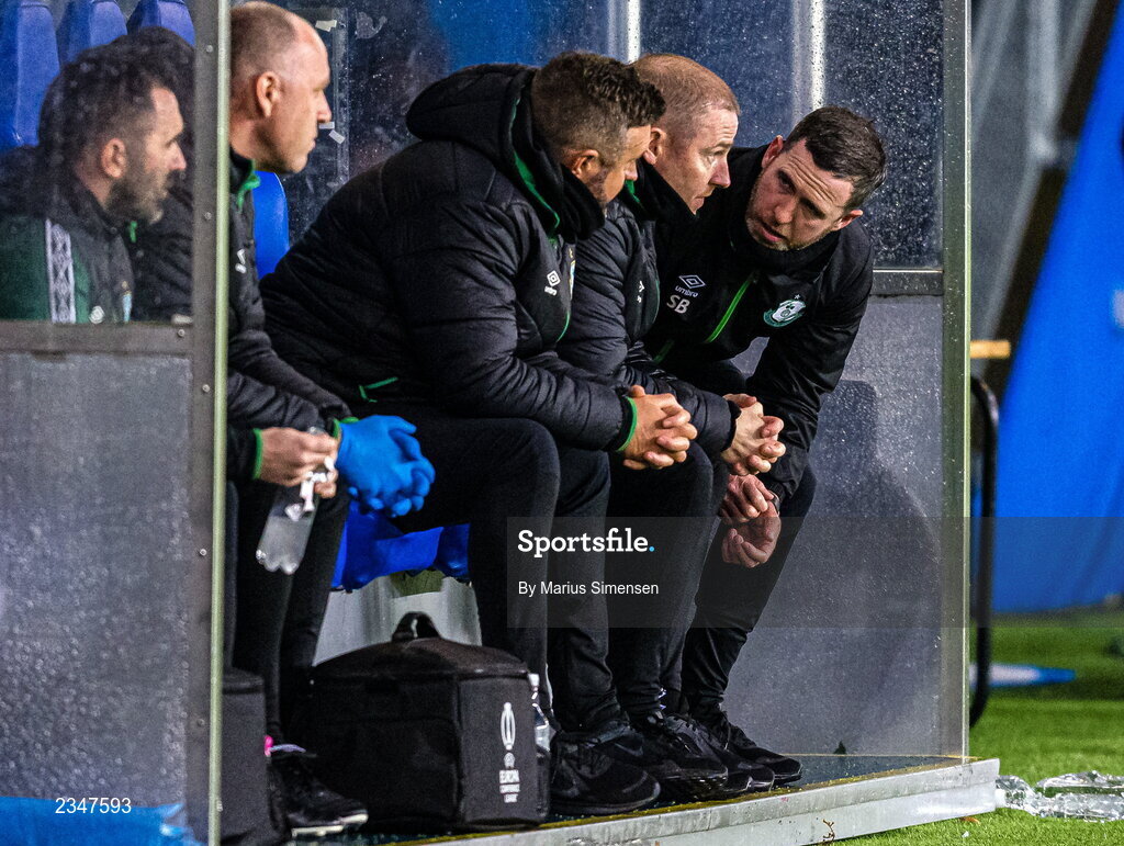 6 October 2022; Shamrock Rovers manager Stephen Bradley, right, in conversation with assistant coach Glenn Cronin, centre, and sporting director Stephen McPhail, left, during the UEFA Europa Conference League group F match between Molde and Shamrock Rovers at Aker Stadion in Molde, Norway. Photo by Marius Simensen/Sportsfile