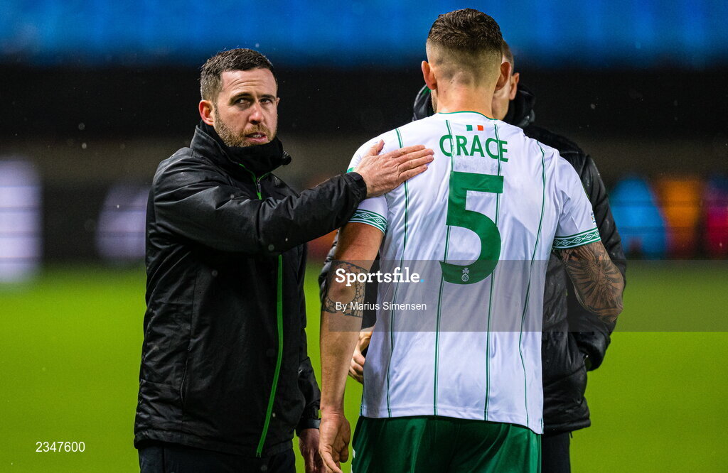 6 October 2022; Shamrock Rovers manager Stephen Bradley, left, and Lee Grace after their side's defeat in the UEFA Europa Conference League group F match between Molde and Shamrock Rovers at Aker Stadion in Molde, Norway. Photo by Marius Simensen/Sportsfile