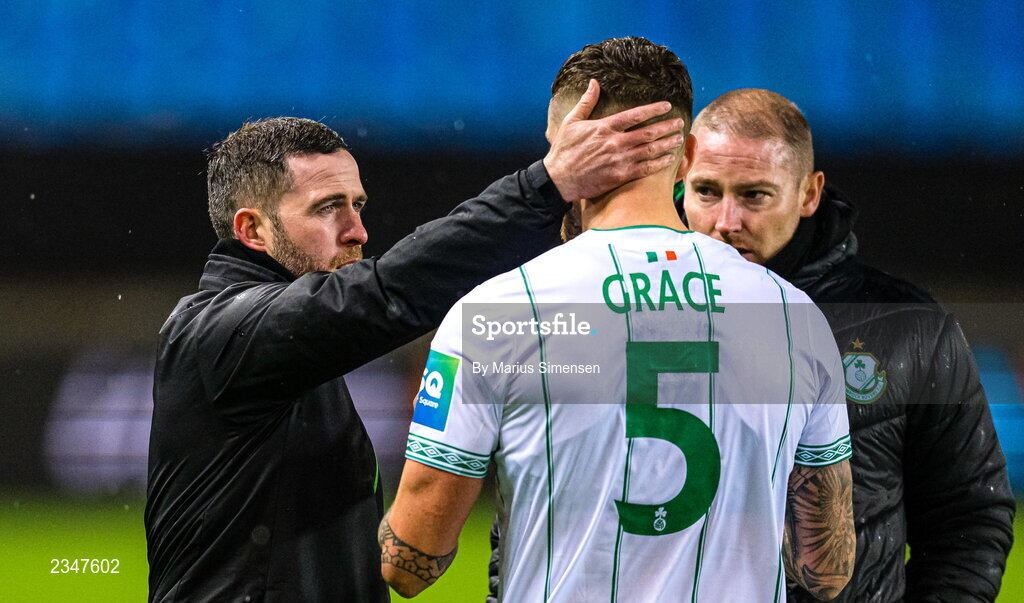 6 October 2022; Shamrock Rovers manager Stephen Bradley, left, and Lee Grace after their side's defeat in the UEFA Europa Conference League group F match between Molde and Shamrock Rovers at Aker Stadion in Molde, Norway. Photo by Marius Simensen/Sportsfile
