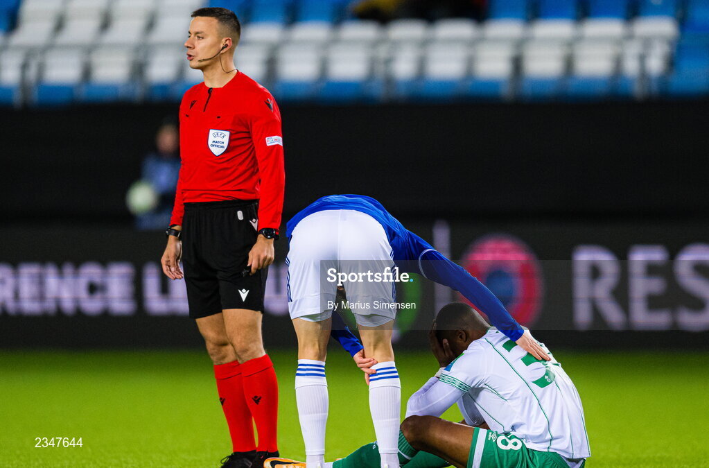 6 October 2022; Aidomo Emakhu of Shamrock Rovers in pain during the UEFA Europa Conference League group F match between Molde and Shamrock Rovers at Aker Stadion in Molde, Norway. Photo by Marius Simensen/Sportsfile