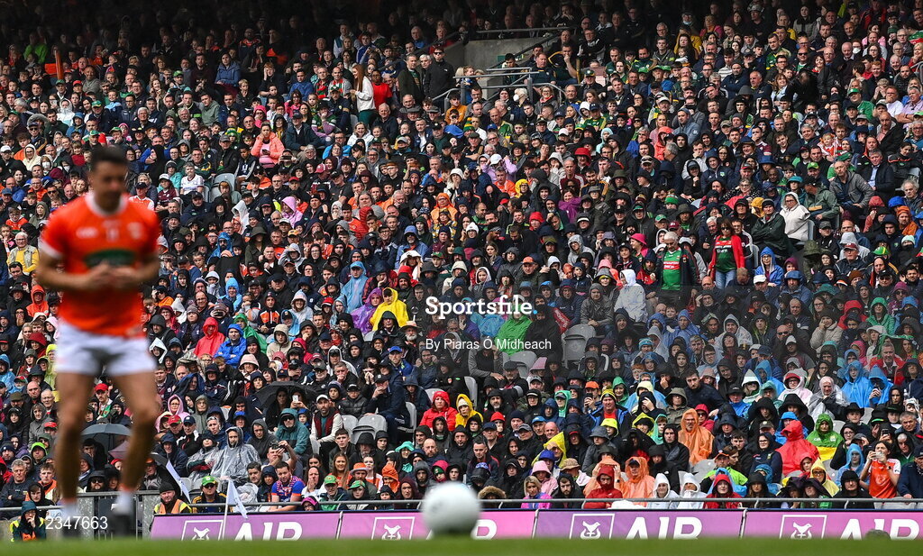 26 June 2022; Spectators look on as Stefan Campbell of Armagh prepares to take a penalty in the penalty shoot-out of the GAA Football All-Ireland Senior Championship Quarter-Final match between Armagh and Galway at Croke Park, Dublin. Photo by Piaras Ó Mídheach/Sportsfile