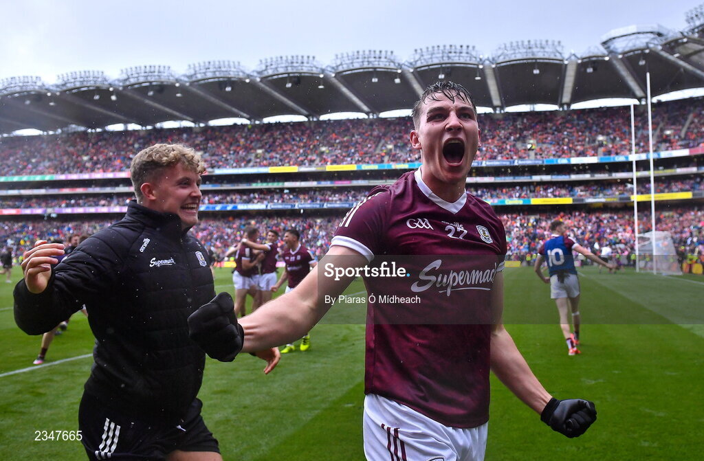 26 June 2022; Matthew Tierney of Galway celebrates after scoring the winning penalty in the penalty shoot-out of the GAA Football All-Ireland Senior Championship Quarter-Final match between Armagh and Galway at Croke Park, Dublin. Photo by Piaras Ó Mídheach/Sportsfile