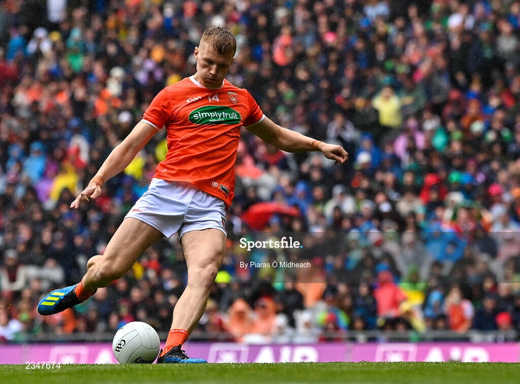 26 June 2022; Rian O'Neill of Armagh scores a penalty in the penalty shoot-out of the GAA Football All-Ireland Senior Championship Quarter-Final match between Armagh and Galway at Croke Park, Dublin. Photo by Piaras Ó Mídheach/Sportsfile