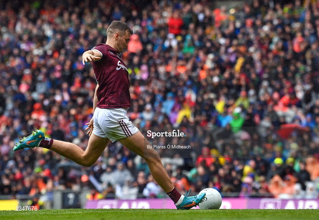 26 June 2022; Robert Finnerty of Galway scores a penalty in the penalty shoot-out of the GAA Football All-Ireland Senior Championship Quarter-Final match between Armagh and Galway at Croke Park, Dublin. Photo by Piaras Ó Mídheach/Sportsfile