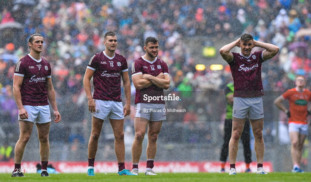 26 June 2022; Galway players, from left, Kieran Molloy, Robert Finnerty, Damien Comer and Shane Walsh during the penalty shoot-out of the GAA Football All-Ireland Senior Championship Quarter-Final match between Armagh and Galway at Croke Park, Dublin. Photo by Piaras Ó Mídheach/Sportsfile