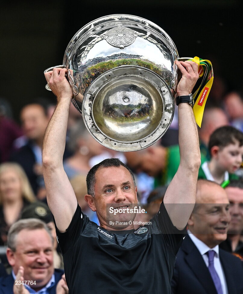 24 July 2022; Kerry nutritionist Kevin Beasley lifts the Sam Maguire Cup after his side's victory in the GAA Football All-Ireland Senior Championship Final match between Kerry and Galway at Croke Park in Dublin. Photo by Piaras Ó Mídheach/Sportsfile