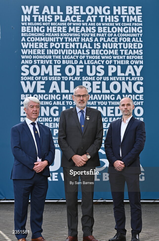 13 October 2022; In attendance during the GAA Referees Respect Day at Croke Park in Dublin are, from left, Referee Development Committee Chairperson Sean Martin, Uachtarán Chumann Lúthchleas Gael Larry McCarthy, and Lecturer in Sport and Exercise Psychology at Ulster University, Dr Noel Brick. Photo by Sam Barnes/Sportsfile