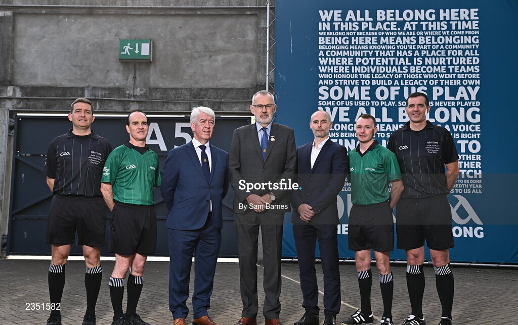 13 October 2022; In attendance during the GAA Referees Respect Day at Croke Park in Dublin are, from left, Referee Colm Lyons, Referee David Coldrick, Referee Development Committee Chairperson Sean Martin, Uachtarán Chumann Lúthchleas Gael Larry McCarthy,Lecturer in Sport and Exercise Psychology at Ulster University, Dr Noel Brick, Referee Thomas Gleeson and Referee Sean Hurson. Photo by Sam Barnes/Sportsfile