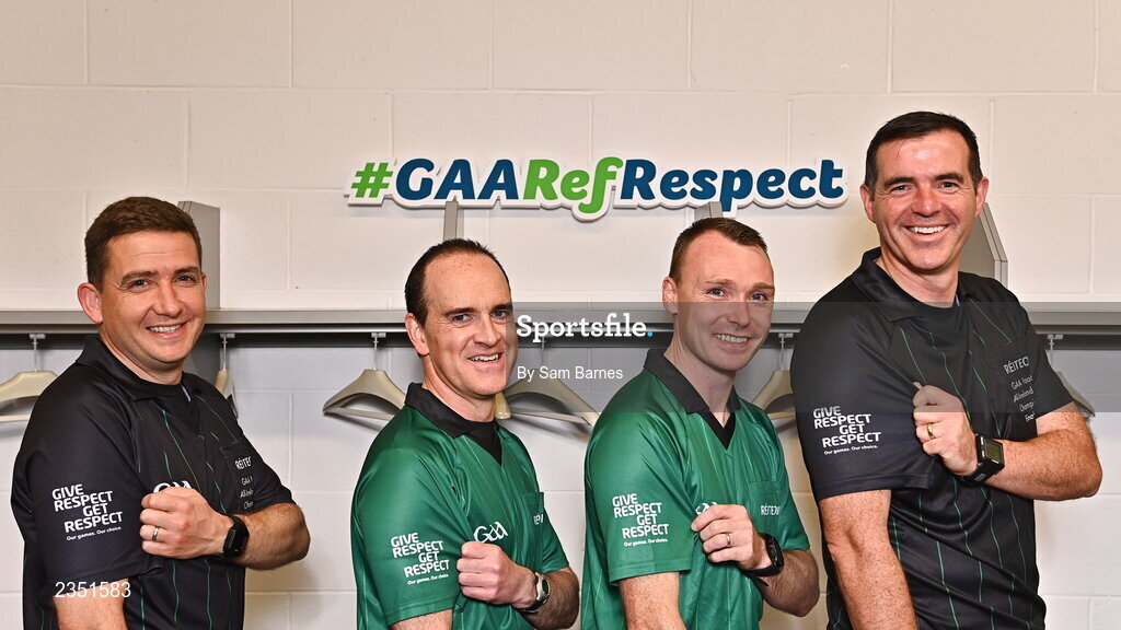 13 October 2022; In attendance during the GAA Referees Respect Day at Croke Park in Dublin are referees, from left, Colm Lyons, David Coldrick Sean Hurson and Thomas Gleeson. Photo by Sam Barnes/Sportsfile