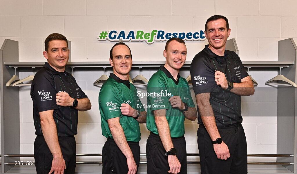 13 October 2022; In attendance during the GAA Referees Respect Day at Croke Park in Dublin are referees, from left, Colm Lyons, David Coldrick Sean Hurson and Thomas Gleeson. Photo by Sam Barnes/Sportsfile