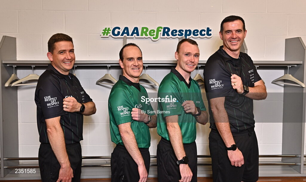 13 October 2022; In attendance during the GAA Referees Respect Day at Croke Park in Dublin are referees, from left, Colm Lyons, David Coldrick Sean Hurson and Thomas Gleeson. Photo by Sam Barnes/Sportsfile