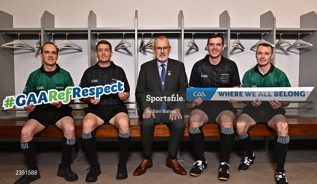 13 October 2022; In attendance during the GAA Referees Respect Day at Croke Park in Dublin are Uachtarán Chumann Lúthchleas Gael Larry McCarthy, centre, with referees, from left, David Coldrick, Colm Lyons, Thomas Gleeson and Sean Hurson. Photo by Sam Barnes/Sportsfile