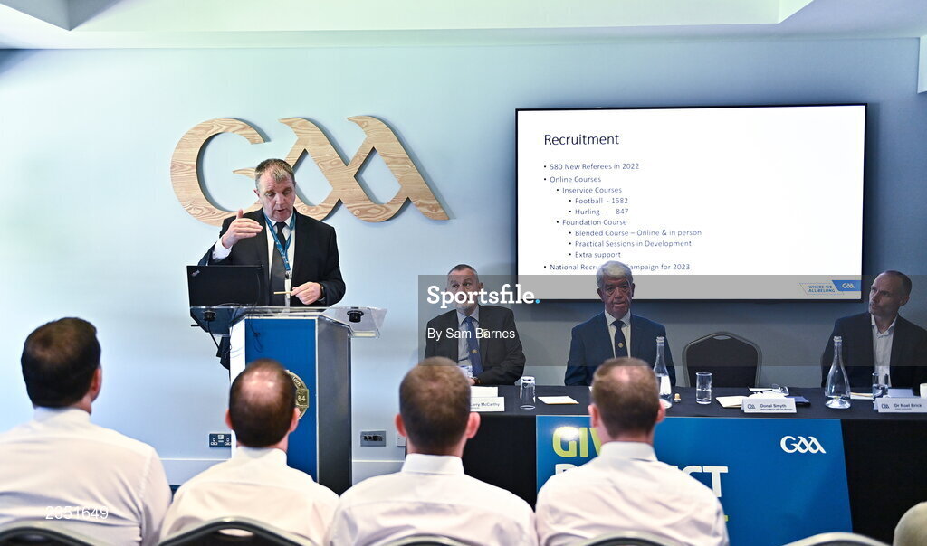 13 October 2022; National Match Officials Manager, Donal Smyth speaking during the GAA Referees Respect Day at Croke Park in Dublin. Photo by Sam Barnes/Sportsfile