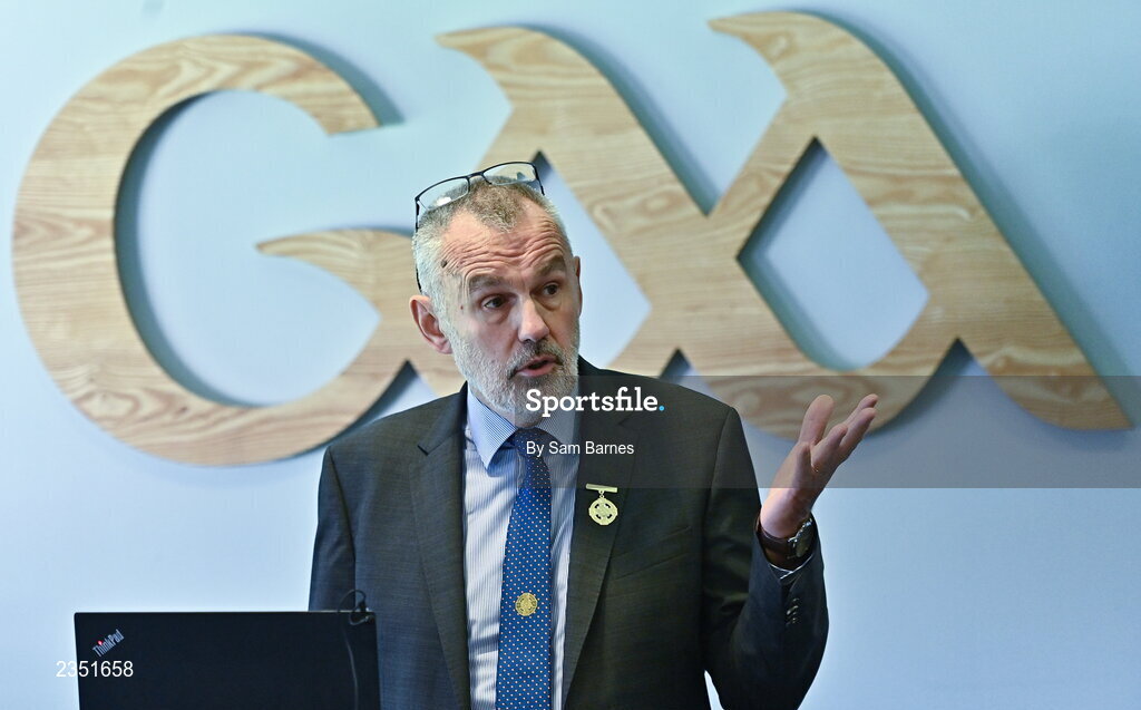 13 October 2022; Uachtarán Chumann Lúthchleas Gael Larry McCarthy speaking during the GAA Referees Respect Day at Croke Park in Dublin. Photo by Sam Barnes/Sportsfile