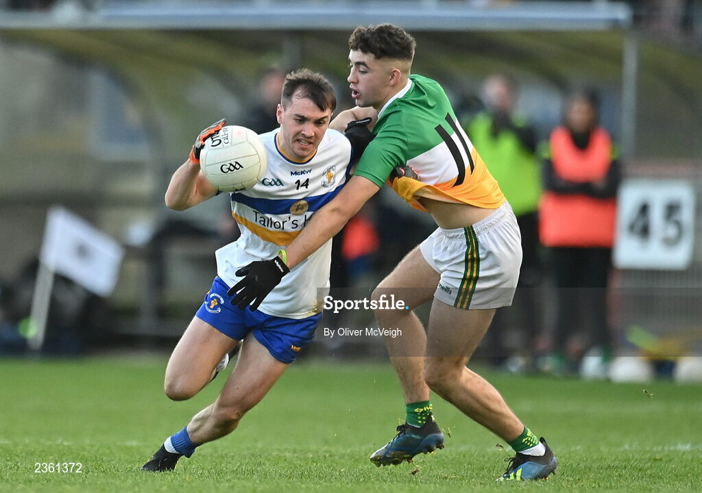 30 October 2022; Darragh Canavan of Errigal Ciarán in action against James Donaghy of Carrickmore during the Tyrone County Senior Club Football Championship Final match between Errigal Ciarán and Carrickmore at O'Neills Healy Park in Omagh, Tyrone. Photo by Oliver McVeigh/Sportsfile