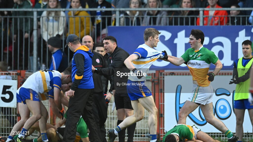 30 October 2022; players from both sides tussle during the Tyrone County Senior Club Football Championship Final match between Errigal Ciarán and Carrickmore at O'Neills Healy Park in Omagh, Tyrone. Photo by Oliver McVeigh/Sportsfile
