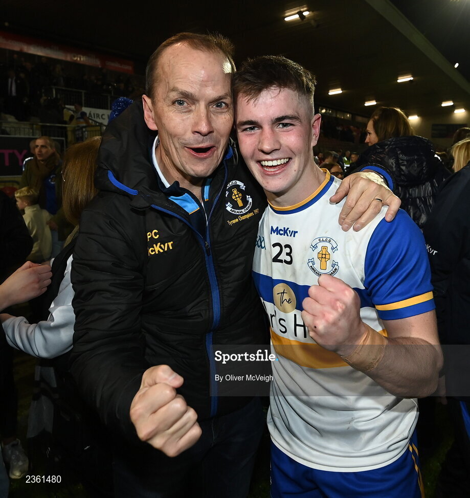 30 October 2022; Ruairi Canavan of Errigal Ciarán celebrates with his uncle Pascal Canavan after the Tyrone County Senior Club Football Championship Final match between Errigal Ciarán and Carrickmore at O'Neills Healy Park in Omagh, Tyrone. Photo by Oliver McVeigh/Sportsfile