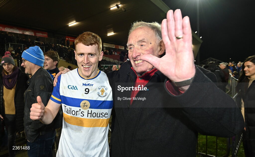 30 October 2022; Peter Harte of Errigal Ciarán celebrates with supporter Frankie McGarvey after the Tyrone County Senior Club Football Championship Final match between Errigal Ciarán and Carrickmore at O'Neills Healy Park in Omagh, Tyrone. Photo by Oliver McVeigh/Sportsfile