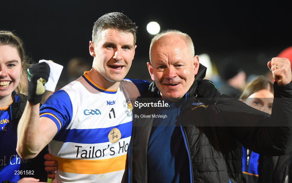 30 October 2022; Errigal Ciarán captain Tommy Canavan and his father Stevie Canavan celebrate after the Tyrone County Senior Club Football Championship Final match between Errigal Ciarán and Carrickmore at O'Neills Healy Park in Omagh, Tyrone. Photo by Oliver McVeigh/Sportsfile