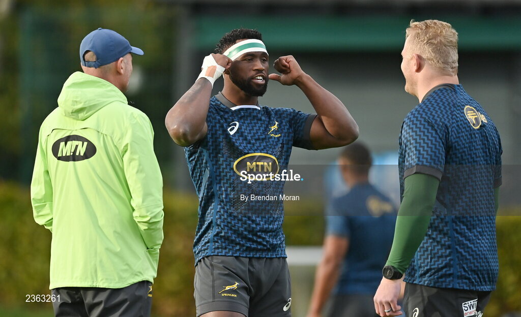 1 November 2022; Captain Siya Kolisi, right, with head coach Jacques Nienaber, left, during South Africa rugby squad training at UCD in Dublin. Photo by Brendan Moran/Sportsfile
