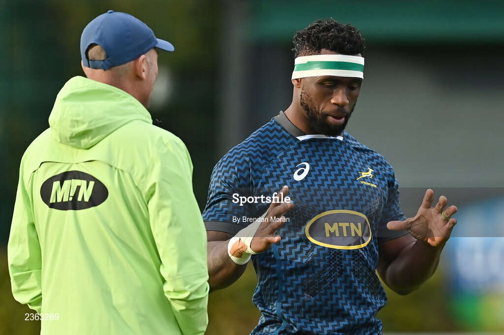 1 November 2022; Captain Siya Kolisi, right, with head coach Jacques Nienaber during South Africa rugby squad training at UCD in Dublin. Photo by Brendan Moran/Sportsfile