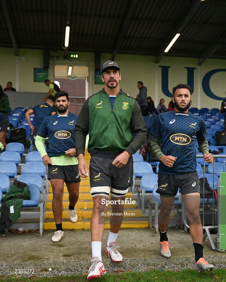 1 November 2022; South Africa players, from left, Damian de Allende, Eben Etzebeth and Jaden Hendrikse arrive for squad training at UCD in Dublin. Photo by Brendan Moran/Sportsfile