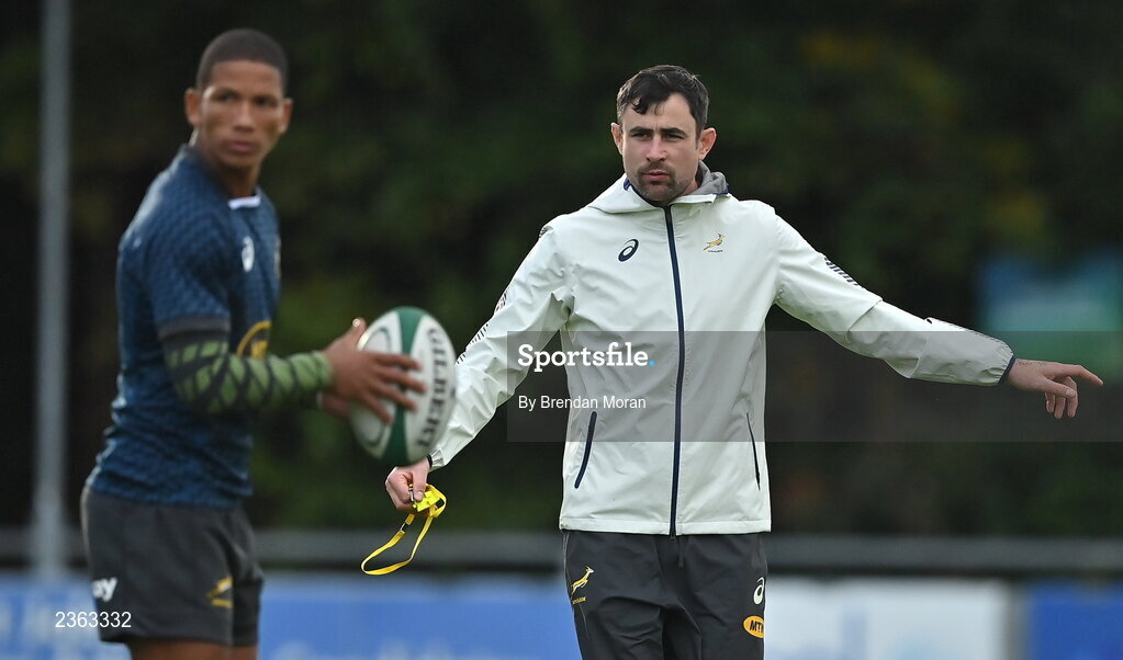 1 November 2022; South Africa assistant coach Felix Jones and Manie Libbok during South Africa rugby squad training at UCD in Dublin. Photo by Brendan Moran/Sportsfile