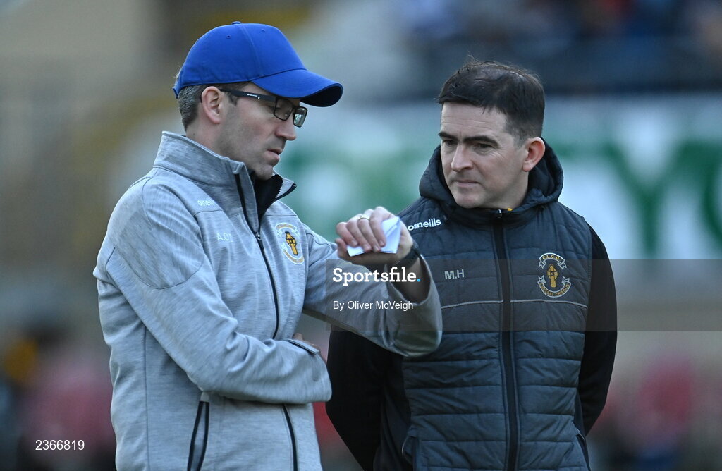 30 October 2022; Errigal Ciarán joint managers Adrian O'Donnell, left, and Mark Harte during the Tyrone County Senior Club Football Championship Final match between Errigal Ciarán and Carrickmore at O'Neills Healy Park in Omagh, Tyrone. Photo by Oliver McVeigh/Sportsfile